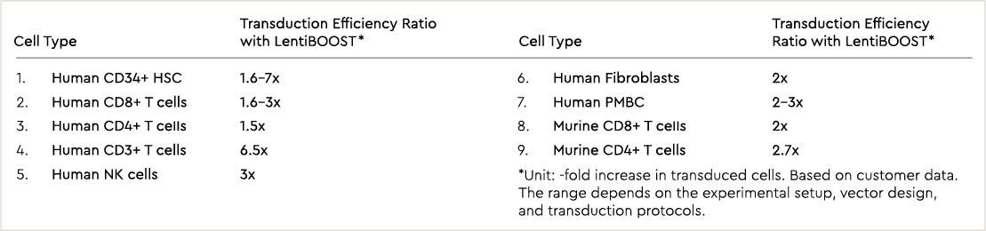 根據實測數據,LentiBOOST™ 在CD34+ 造血幹細胞 (HSC)、間質幹細胞 (MSC)、初代 T 細胞、NK 細胞及纖維母細胞中,最高可提升轉導效率達 7