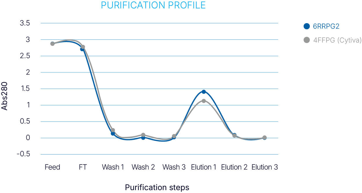 如下圖所示,ABT resin 在純化效率與動態結合能力上均優於對照組 (Cytiva 4FFPG)