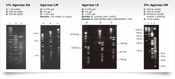 - ABT Agarose LE: 擁有較高的解析度,條帶清晰明確,依據濃度差別適合 0.2-23 kb 的核酸電泳分析實驗。
