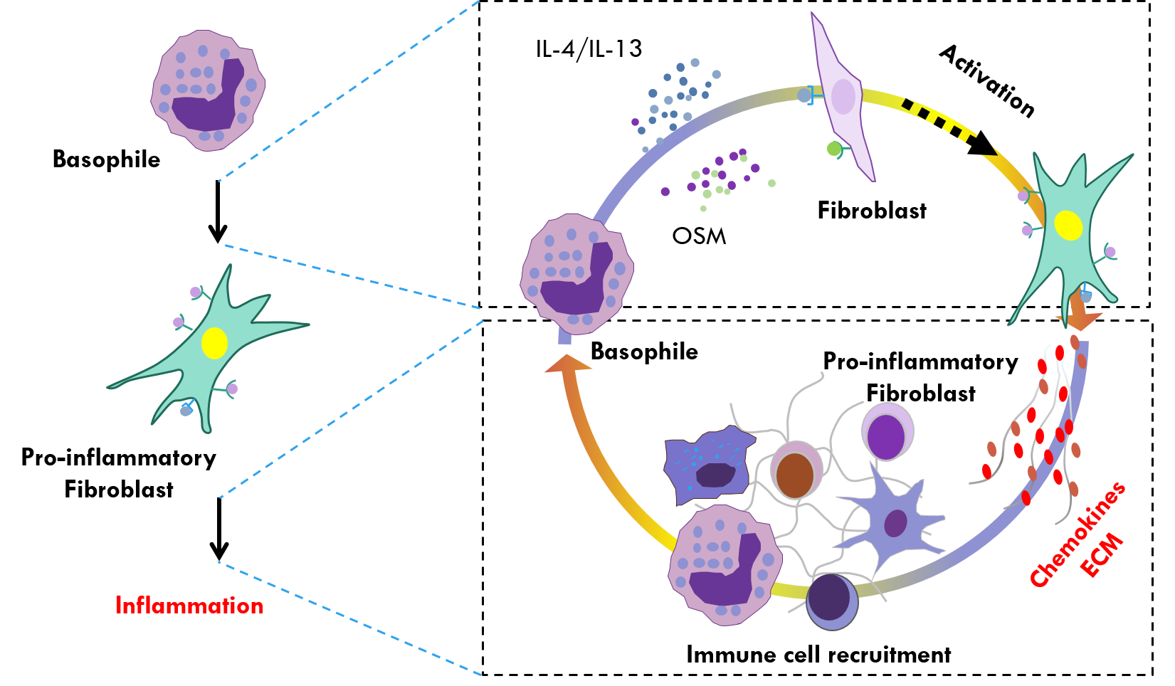 - 嗜鹼性球(basophils)在發炎早期分泌 IL-4 與 oncostatin M(OSM),直接活化鄰近的纖維母細胞(fibroblasts)。