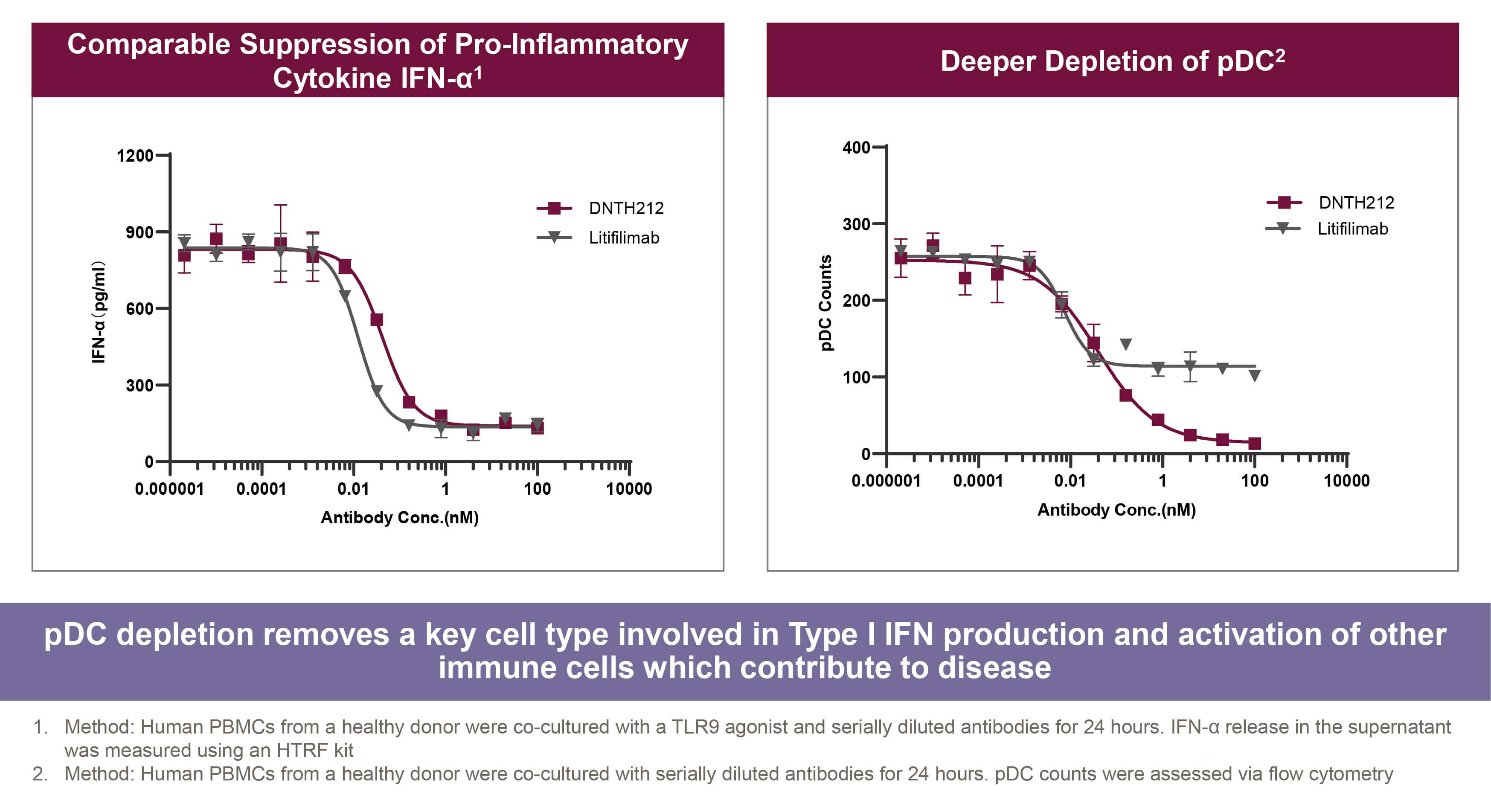 在 DNTH212 從標的驗證到 IND 申請的過程中,精確數據是佐證療效優勢的基石。針對抑制 pDC 的 BDCA2 以阻斷IFN-α分泌的核心機轉,維立志博研發團隊選用HTRF Human IFN-α